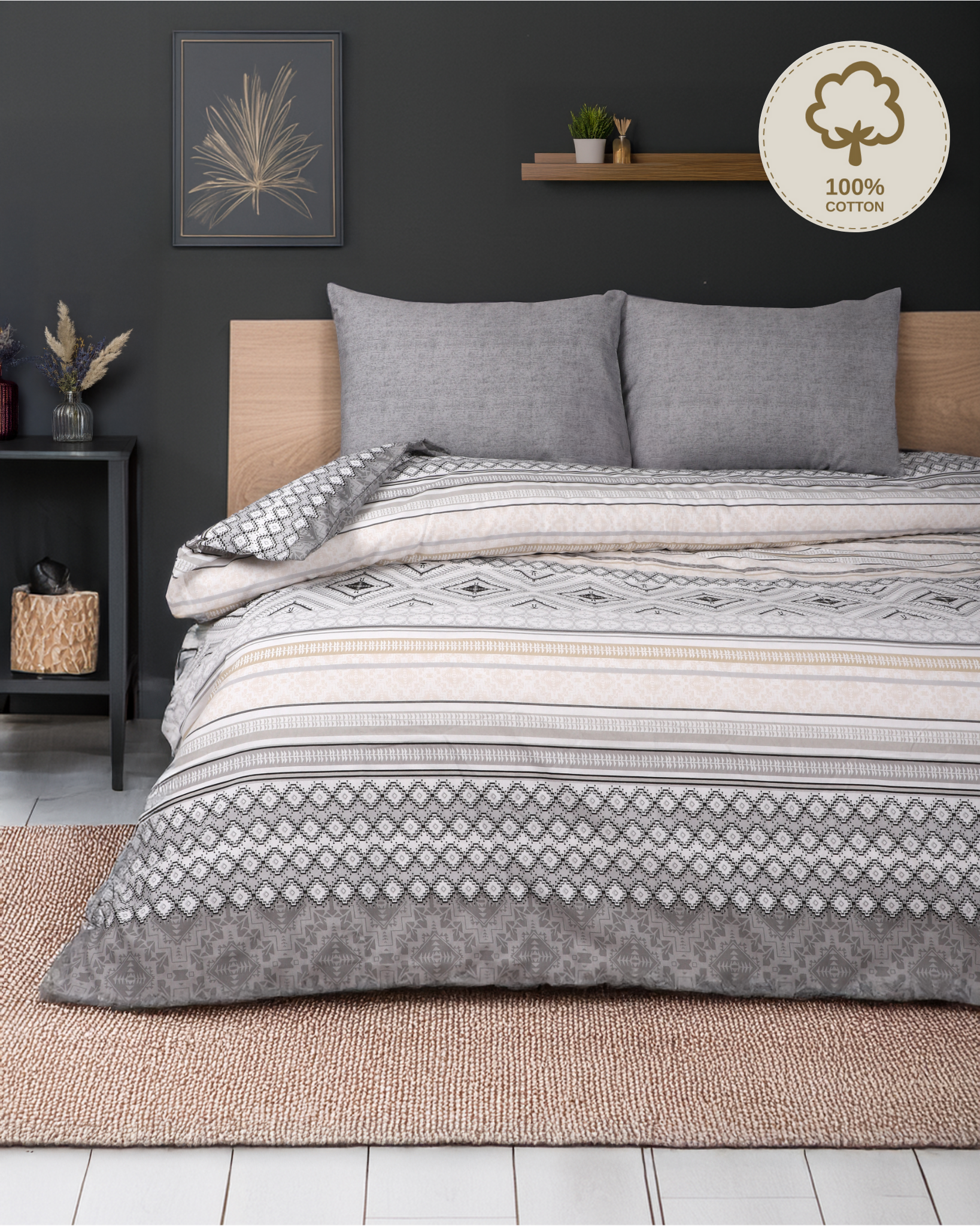 %100 Pamuk Gri Etnik Desenli Solmaya Dayanıklı Nevresim Takımı – Çift Kişilik